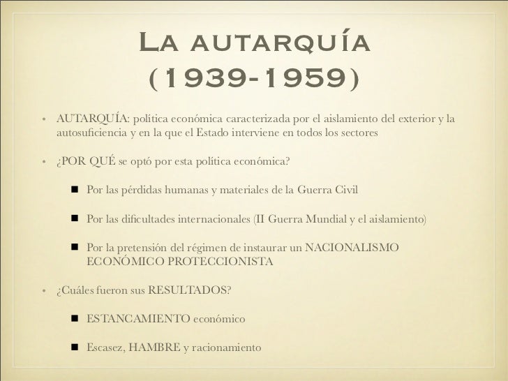 Con el fin de la Guerra Civil en 1939, se impone la autarquía económica, de inspiración fascista y que propugna la sustitución del libre mercado por la intervención del Estado en la economía, reglamentando todos los aspectos de la actividad económica. La autarquía se prolongará más allá de la derrota de Hitler en 1945 y la razón hay que buscarla no sólo en el interés del régimen franquista por limitar los intercambios con el exterior, y autoabastecerse de todos las materias primas y productos posibles, sino en el aislamiento internacional de España después de la Segunda Guerra Mundial (el país quedaba al margen del Plan Marshall de ayuda a la recuperación económica después de la guerra).